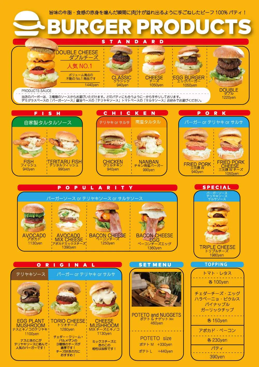 ジューシーなパティにとろとろチーズ!至極の組み合わせ!パティダブルで大満足!!トッピングができます。<材料> ビーフ100%パティ、バンズ、チェダーチーズ、レタス、トマト、ピクルス、マヨネーズ。 |